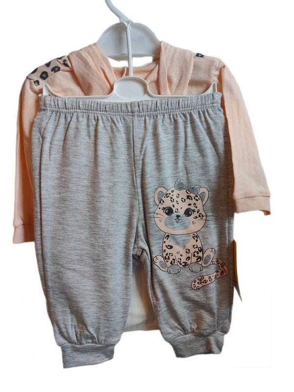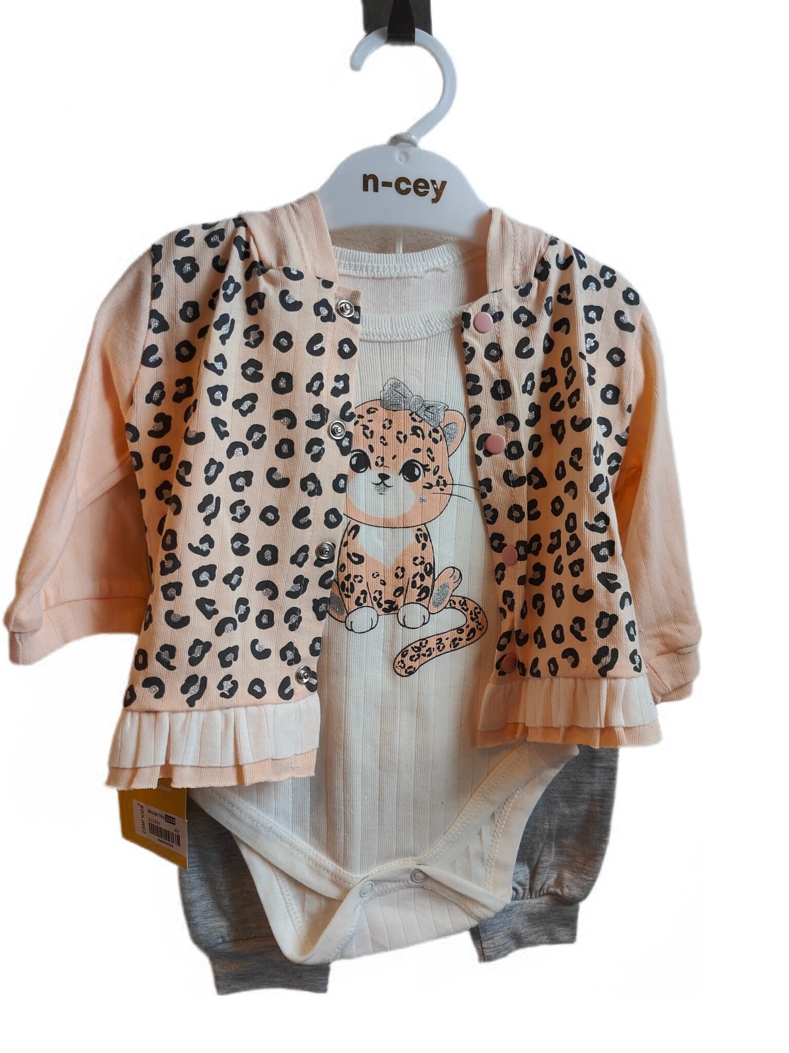 3-in-1 set bestaat uit een body, een jasje met drukknoopjes en een broekje met een mooie luipaardprint